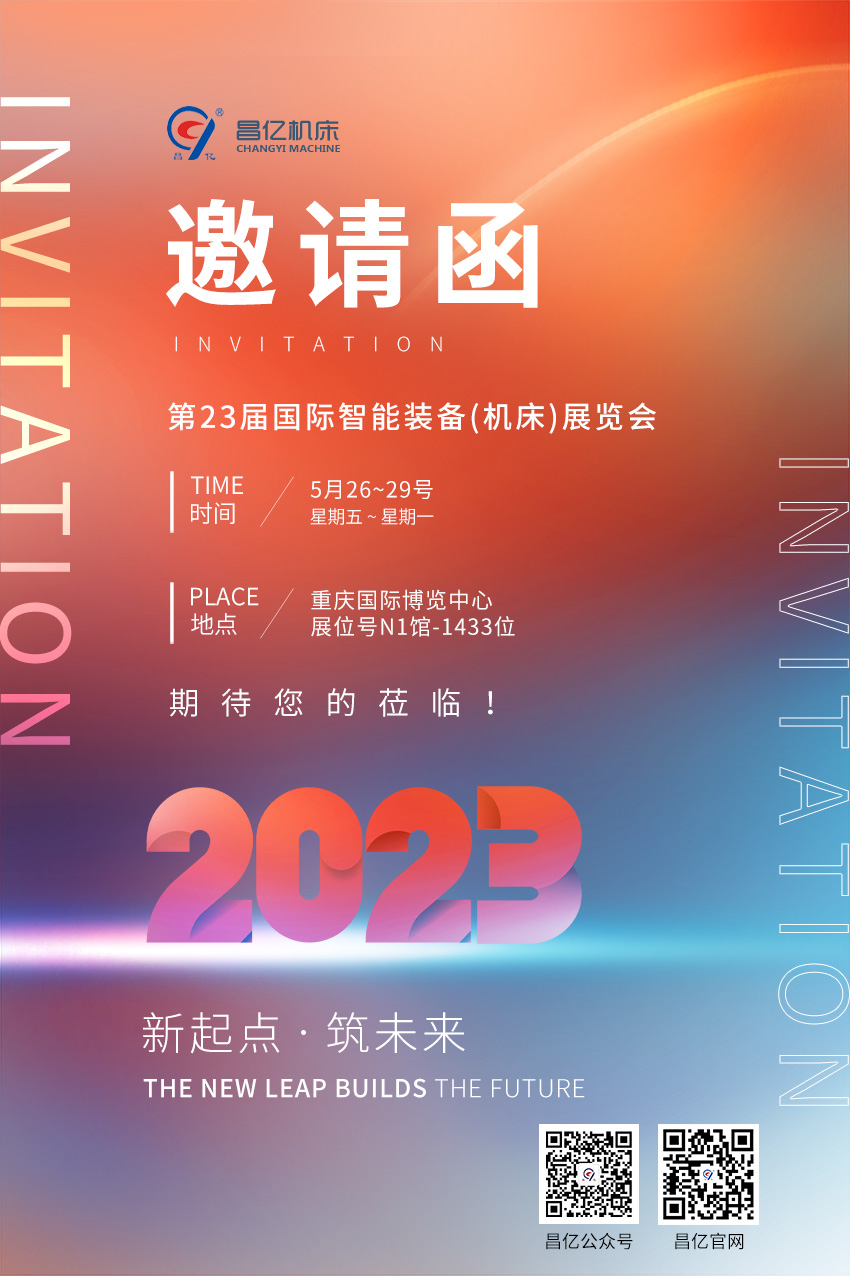 無(wú)錫市昌億機(jī)床制造有限公司5月26一29號(hào)參加在重慶國(guó)際博覽中心舉辦的第23屆國(guó)際智能裝備(機(jī)床)展覽會(huì),展位號(hào)N1館一1433位,歡迎各位同仁前來(lái)參觀指導(dǎo)!