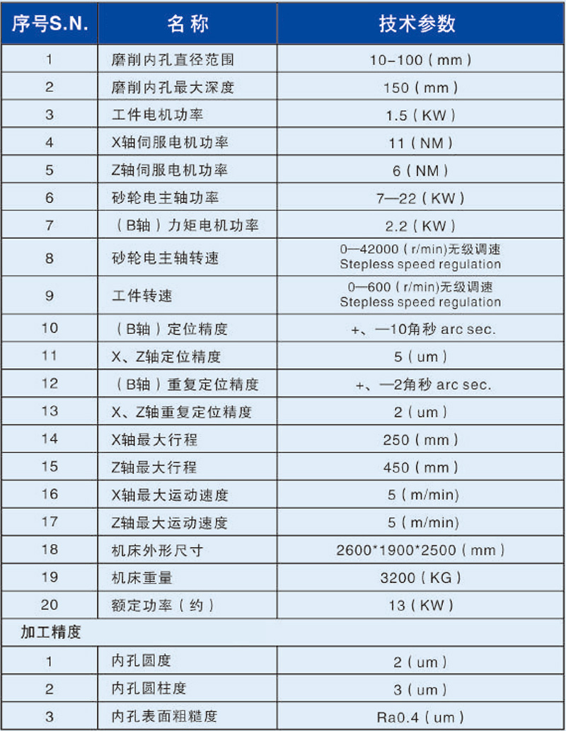 ●本機(jī)床為三軸(X進(jìn)給、Z砂輪、B分度軸)數(shù)控內(nèi)圓磨床,主要用于磨削工件的內(nèi)圓孔、內(nèi)錐孔、內(nèi)端面、外端面的磨削。磨削循環(huán)均自動(dòng)完成(具有自動(dòng)進(jìn)刀、退刀、粗磨、精磨;自動(dòng)修正砂輪、自動(dòng)補(bǔ)償?shù)裙δ埽?br /> ●機(jī)床采用工件進(jìn)給,B軸分度(力矩轉(zhuǎn)臺(tái)),工作臺(tái)(砂輪架)左右運(yùn)動(dòng)的結(jié)構(gòu)方式,工件箱進(jìn)給及砂輪架運(yùn)動(dòng)導(dǎo)軌均為滾動(dòng)直線導(dǎo)軌,均由伺服電機(jī)驅(qū)動(dòng)滾珠絲杠運(yùn)動(dòng),工件主軸及砂輪主軸旋轉(zhuǎn)速度均由變頻器控制,實(shí)現(xiàn)無(wú)級(jí)調(diào)速。工件夾緊為液壓動(dòng)力卡盤,同時(shí)可以根據(jù)用戶工件的特殊性配置其它相匹配的夾具●機(jī)床為全封閉防護(hù)罩殼,前置回轉(zhuǎn)式操作箱、后置背包式電器柜。