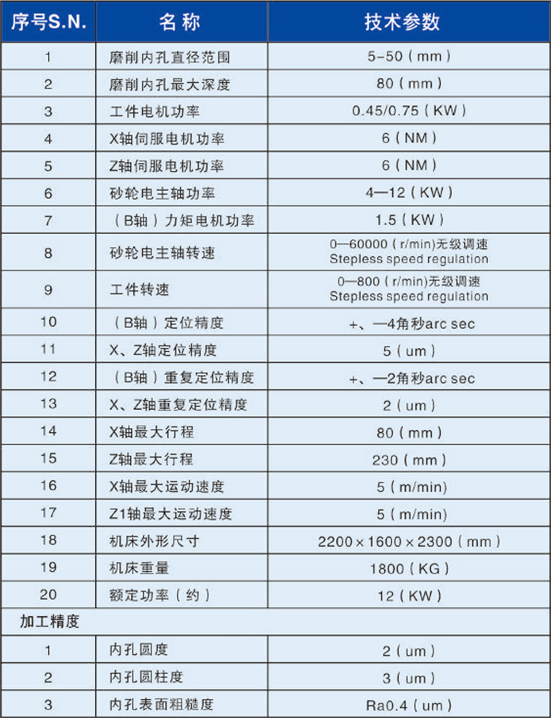●本機(jī)床為三軸(X進(jìn)給、Z砂輪、B分度軸)數(shù)控內(nèi)圓磨床,主要用于磨削工件的內(nèi)圓孔、內(nèi)錐孔、內(nèi)端面、外端面的磨削。磨削循環(huán)均自動完成(具有自動進(jìn)刀、退刀、粗磨、精磨;自動修正砂輪、自動補(bǔ)償?shù)裙δ埽?br /> ●機(jī)床采用工件進(jìn)給,B軸分度(力矩轉(zhuǎn)臺),工作臺(砂輪架)左右運動的結(jié)構(gòu)方式,工件箱進(jìn)給及砂輪架運動導(dǎo)軌均為滾動直線導(dǎo)軌,均由伺服電機(jī)驅(qū)動滾珠絲杠運動,工件主軸及砂輪主軸旋轉(zhuǎn)速度均由變頻器控制,實現(xiàn)無級調(diào)速。工件夾緊為液壓動力卡盤,同時可以根據(jù)用戶工件的特殊性配置其它相匹配的夾具●機(jī)床為全封閉防護(hù)罩殼,前置回轉(zhuǎn)式操作箱、后置背包式電器柜。
