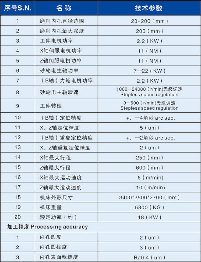 ●本機(jī)床為三軸(X進(jìn)給、Z砂輪、B分度軸)數(shù)控內(nèi)圓磨床,主要用于磨削工件的內(nèi)圓孔、內(nèi)錐孔、內(nèi)端面、外端面的磨削。磨削循環(huán)均自動完成(具有自動進(jìn)刀、退刀、粗磨、精磨;自動修正砂輪、自動補(bǔ)償?shù)裙δ埽?br /> ●機(jī)床采用工件進(jìn)給,B軸分度(力矩轉(zhuǎn)臺),工作臺(砂輪架)左右運動的結(jié)構(gòu)方式,工件箱進(jìn)給及砂輪架運動導(dǎo)軌均為滾動直線導(dǎo)軌,均由伺服電機(jī)驅(qū)動滾珠絲杠運動,工件主軸及砂輪主軸旋轉(zhuǎn)速度均由變頻器控制,實現(xiàn)無級調(diào)速。工件夾緊為液壓動力卡盤,同時可以根據(jù)用戶工件的特殊性配置其它相匹配的夾具●機(jī)床為全封閉防護(hù)罩殼,前置回轉(zhuǎn)式操作箱、后置背包式電器柜。