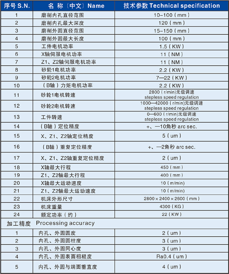 ● 本機床為四軸(X工件橫向進給、Z1、Z2砂輪縱向運動、B水平方向分度)多功能數(shù)控磨床,主要用于磨削工件的內(nèi)圓孔、內(nèi)錐孔、內(nèi)端面、外圓、外錐面、外端面、內(nèi)、外球形等復雜要求的磨削。磨削循環(huán)均自動完成(具有自動進刀、退刀、粗磨、精磨;自動修正砂輪、自動補償?shù)裙δ?。● 機床采用工件進給,B分度(力矩轉臺),二獨立工作臺(砂輪架)左右運動的結構方式,X、Z軸運動導軌均為滾動直線導軌,均由伺服電機驅(qū)動滾珠絲杠運動,工件主軸及砂輪主軸旋轉速度均由變頻器控制,實現(xiàn)無級調(diào)速。工件夾緊為液壓動力卡盤,同時可以根據(jù)用戶工件的特殊性配置其它相匹配的夾具